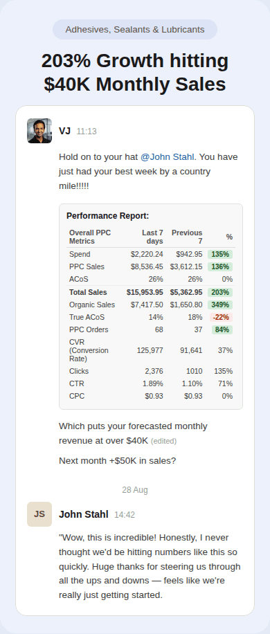 Every system, every process, and every result was built through relentless first-hand experience on the platform. Seeing that talented sellers were consistently held back not by their products, but by getting overwhelmed with the complexity of Amazon's ever-changing landscape.